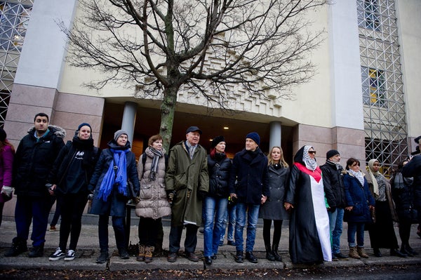 3 Hundreds of Norwegians circled an Oslo synagogue and mosque in a peace ring to stand for interfaith solidarity.JON OLAV NESVOLD via Getty ImagesAfter a synagogue was attacked in Denmark in February, more than 1,000 Muslims formed a human shield around an Oslo synagogue in neighboring Norway, offering symbolic protection for the city's Jewish community. The following weekend, hundreds of Norwegians gathered around an Oslo mosque to form a human peace ring in an effort to show solidarity and respect with the Muslim community.